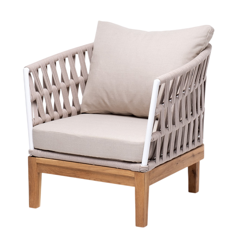 - Описание: Плетеное кресло «Диего» с подушками в комплекте.Основание кресла - дуб, каркас из алюминия белого цвета.Боковины каркаса вручную оплетены роупом - эластичными синтетическими лентами, изготовленными из высокопрочных полиэфирных волокон. Цвет оплетки - бежевый.