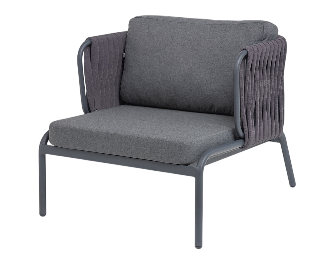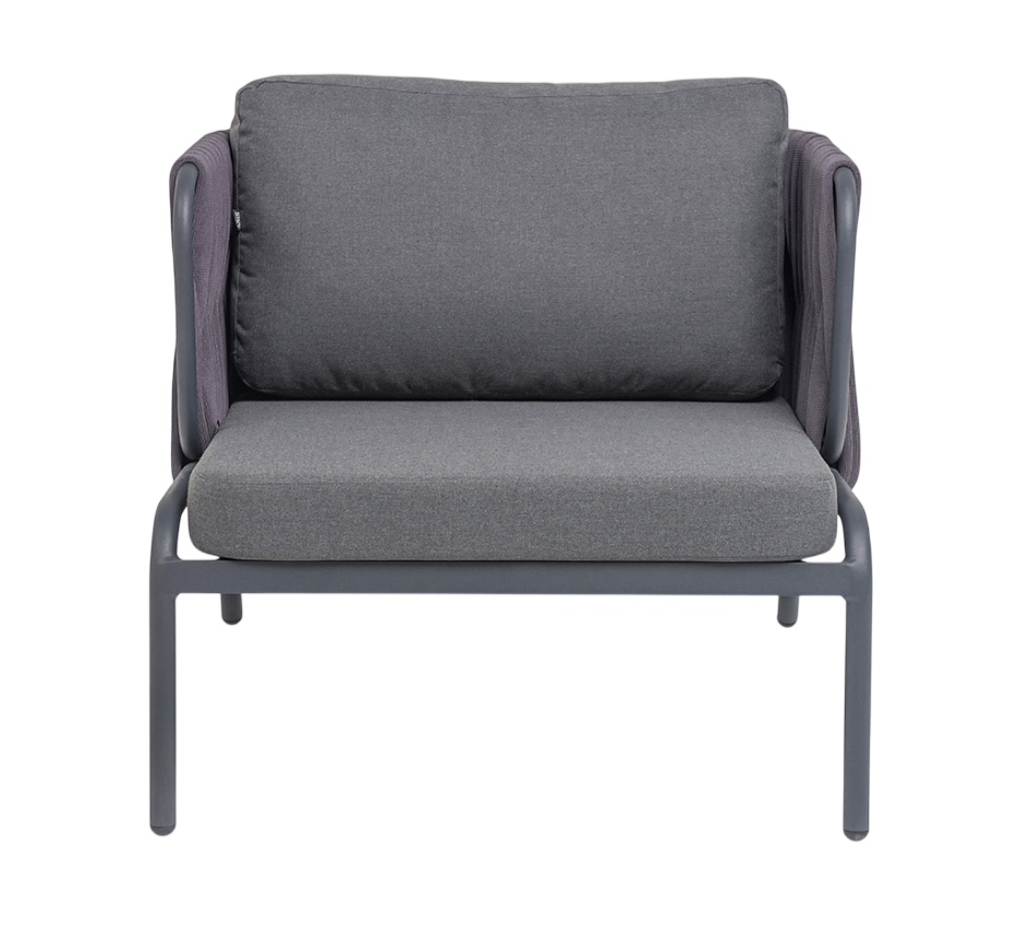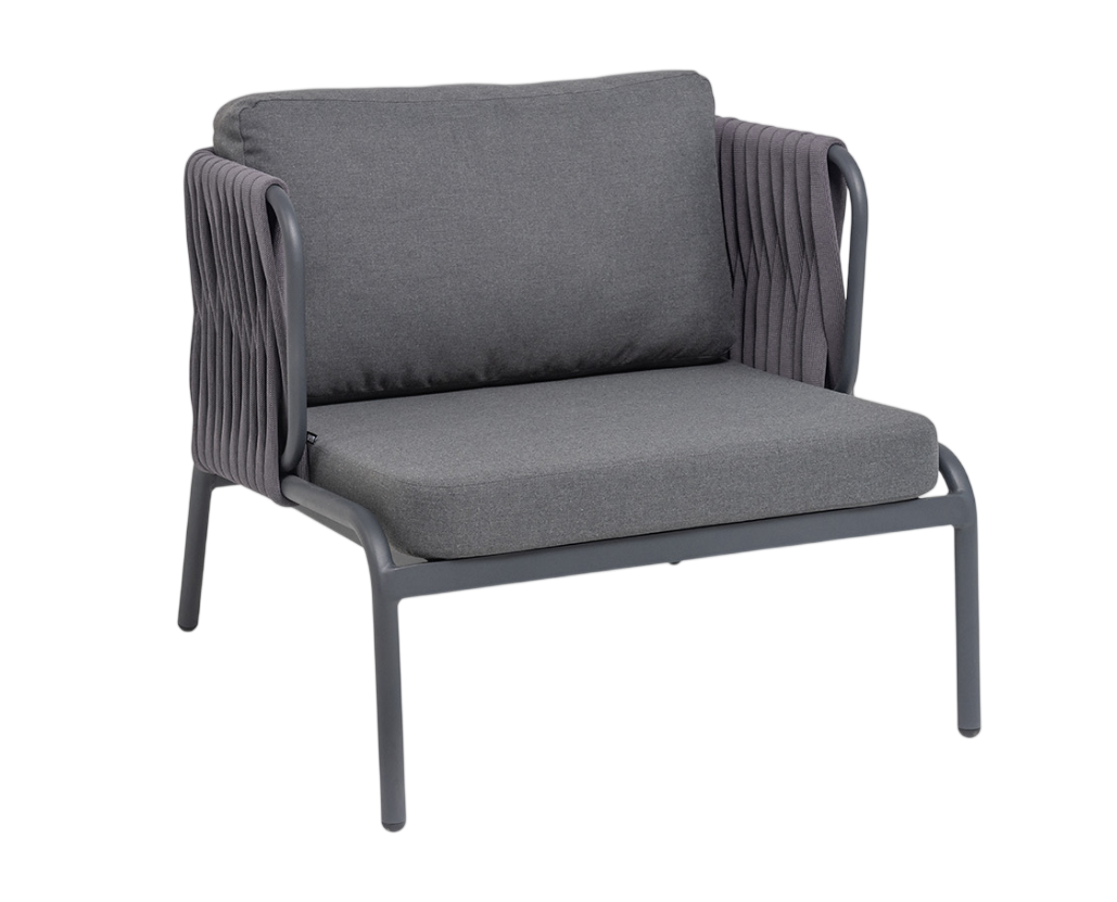 - Преимущество: Плетение. Боковины и спинка вручную оплетены роупом — эластичными синтетическими лентами шириной (40 мм) из высокопрочных полиэфирных волокон. Серый оттенок оплетки гармонично сочетается с цветом каркаса, формируя целостный визуальный образ.Подушки. Оснащены плотным наполнителем и съемными чехлами из 100% полиэстера плотностью 300гр/м2. Благодаря влагоотталкивающей пропитке чехлы легко чистятся, а изделие дольше сохраняет привлекательный внешний вид.