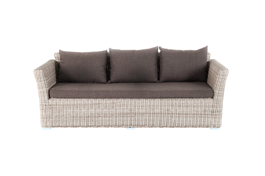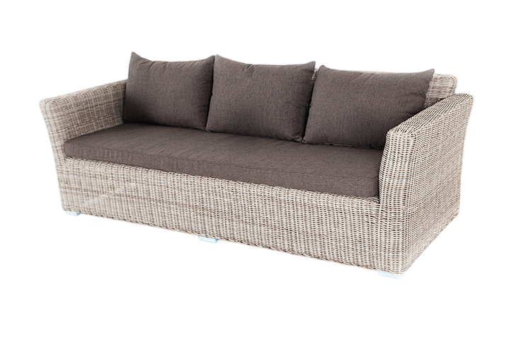 • Описание: Диван «Капучино» предназначается для размещения трех человек. Его основание изготовлено из алюминиевого каркаса, способного выдерживать большие нагрузки. Мебель декорирована ручным круглым плетением, выполненным из искусственного ротанга соломенного цвета. Трехместный диван укомплектован мягкими подушками, которые защищены съёмными чехлами в сером оттенке. При их пошиве используется износостойкий полиэстер, плотность которого достигает 300гр/м2. Предусмотрена влагоотталкивающая пропитка.