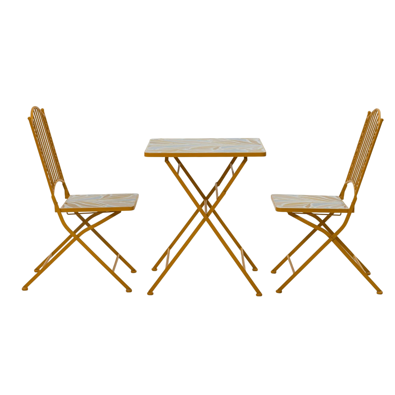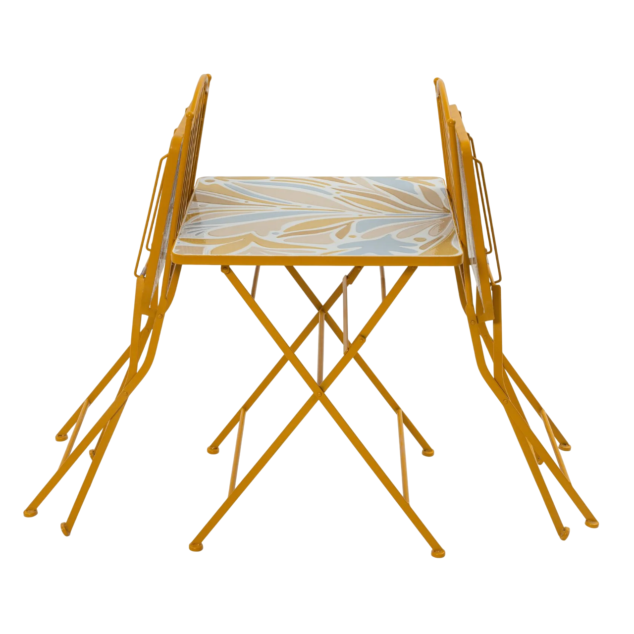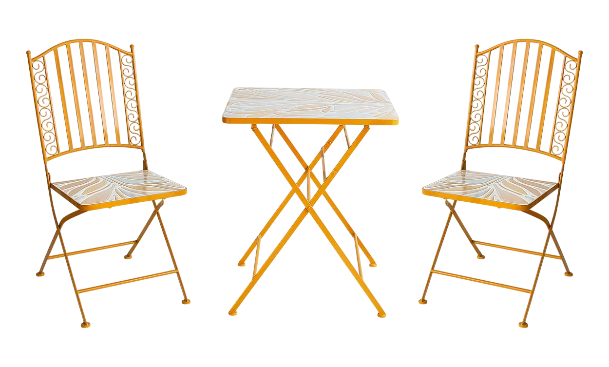 Яркий и стильный дизайн: Кресла с порошковым покрытием солнечного желтого цвета и столик с изысканной столешницей, имитирующей мозаику, моментально поднимут настроение и добавят ярких красок в вашу жизнь. Каждый элемент продуман до мелочей, чтобы создать атмосферу тепла и уюта.