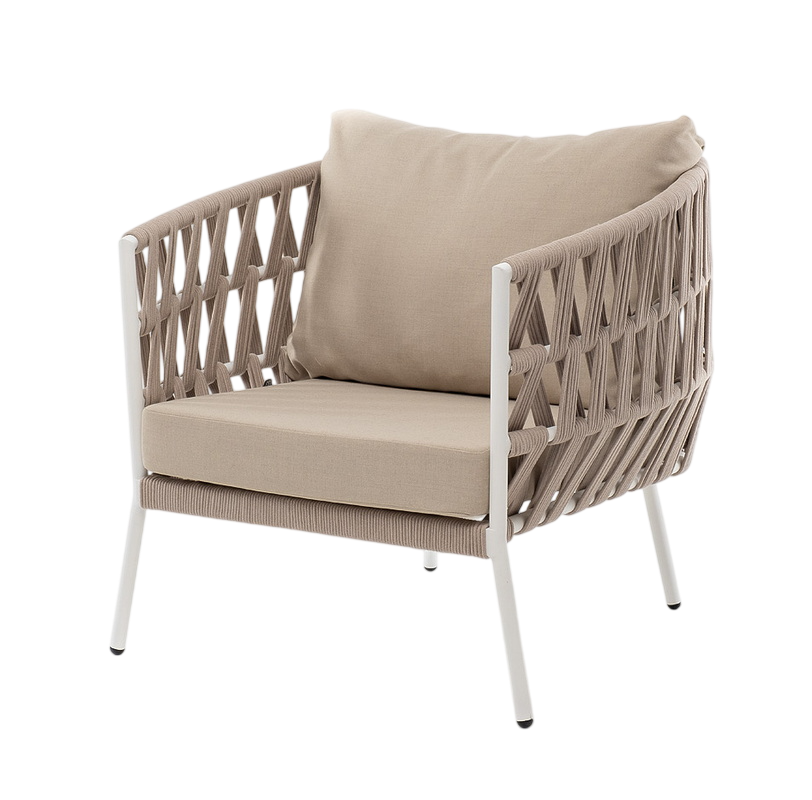 - Описание: Плетеное кресло «Диего» с подушками в комплекте.Кресло имеет алюминиевый каркас, окрашенный порошковой краской. Боковины каркаса вручную оплетены роупом - эластичными синтетическими лентами, изготовленными из высокопрочных полиэфирных волокон.