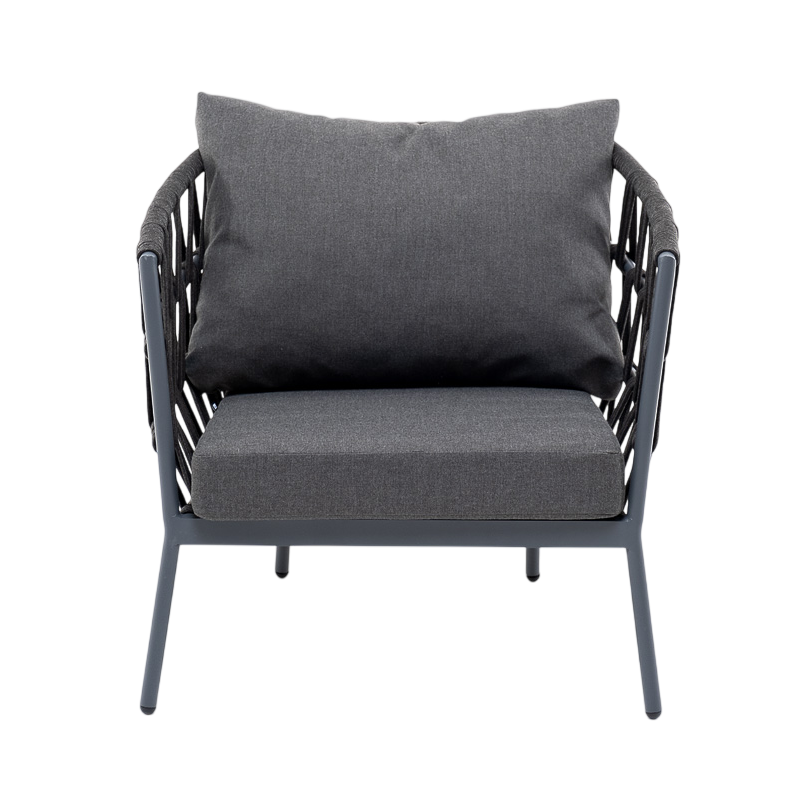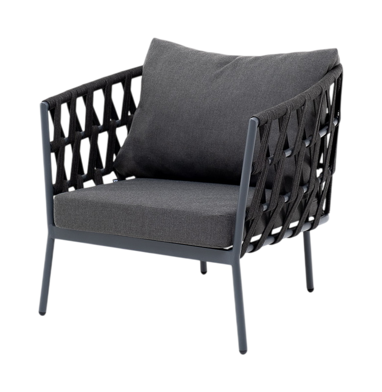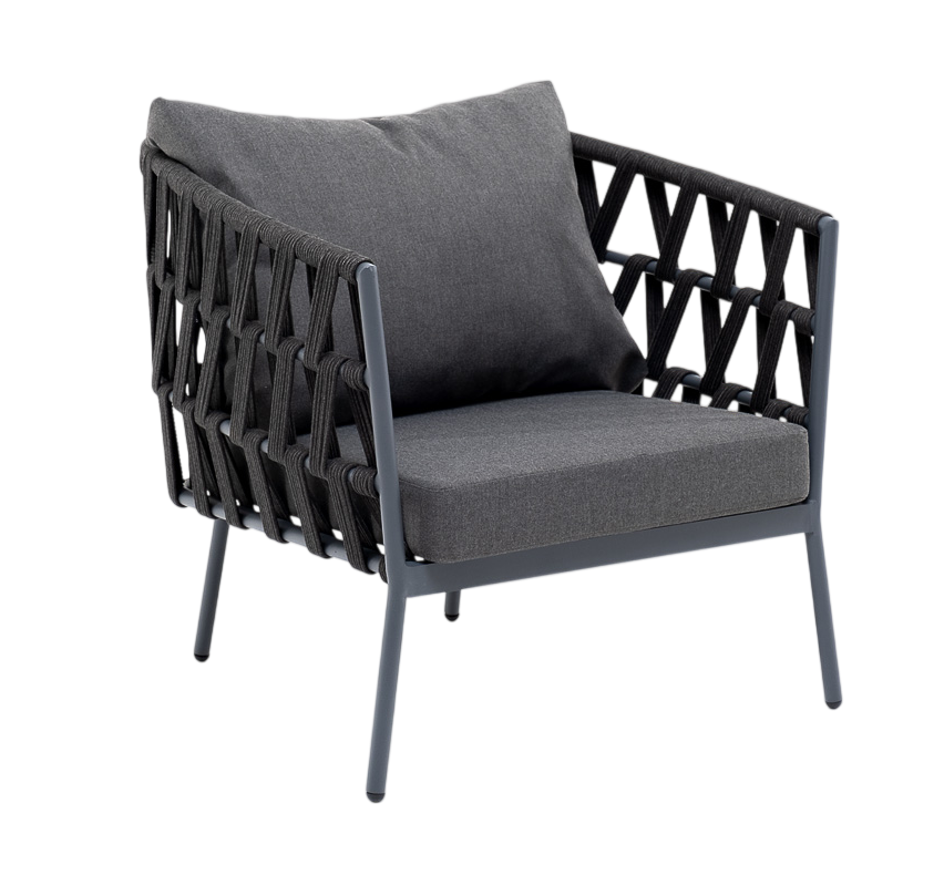 • Описание: Плетеное кресло «Диего» с подушками в комплекте.Кресло имеет алюминиевый каркас, окрашенный порошковой краской. Боковины каркаса вручную оплетены роупом - эластичными синтетическими лентами, изготовленными из высокопрочных полиэфирных волокон.