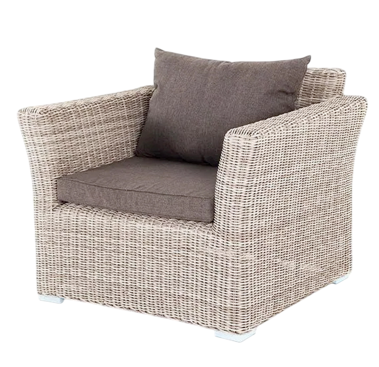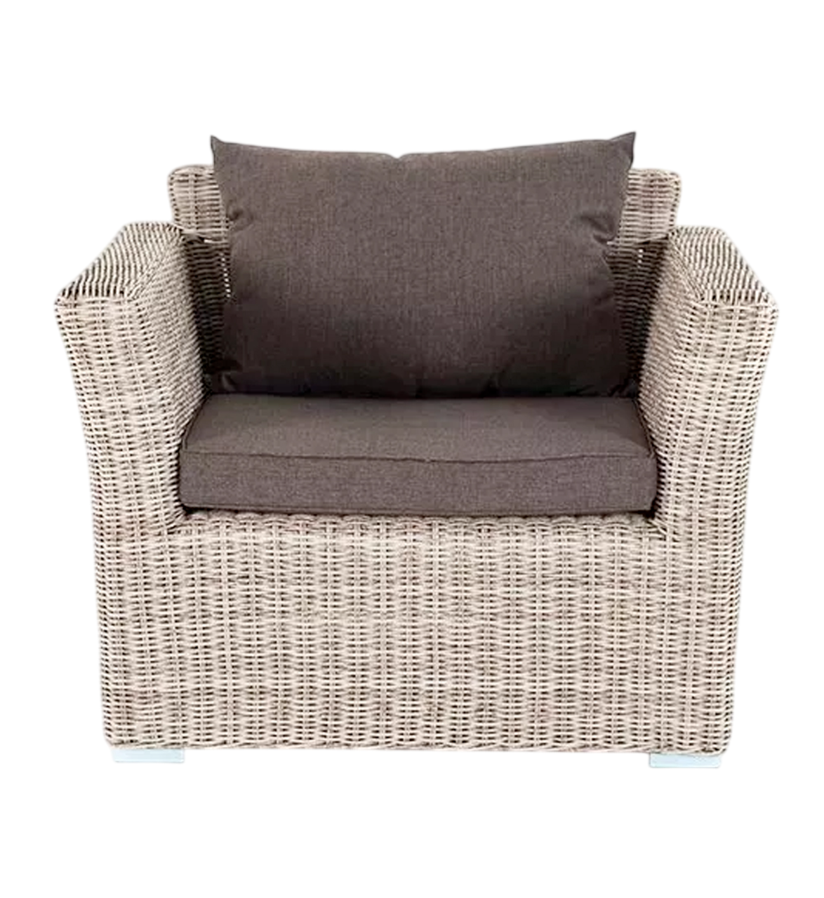 Ее отличает алюминиевый каркас высокой прочности. В качестве декоративной составляющей выступает ручное плетение на основе круглого искусственного ротанга.