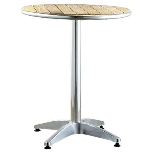 Стол алюминиевый. Каркас - алюминий. Столешница: деревянные перекладины. Верхний крест: 300х300мм сплав чугуна. Труба: Ø58, толщина стенки 1.1мм. Основание крестовое: 580х580мм из алюминия.