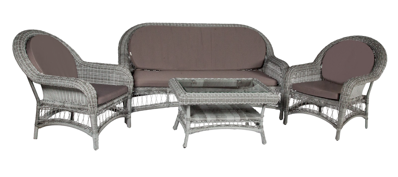 Описание: материал изготовления - искусственный ротанг, обивка - нет, ножки - нержавеющая сталь, столешница - стекло Стол кофейный: 920х620х500 мм. Кресло 780х940х940 мм. Софа 2-х местная: 1500х940х940 мм. Цвет серый