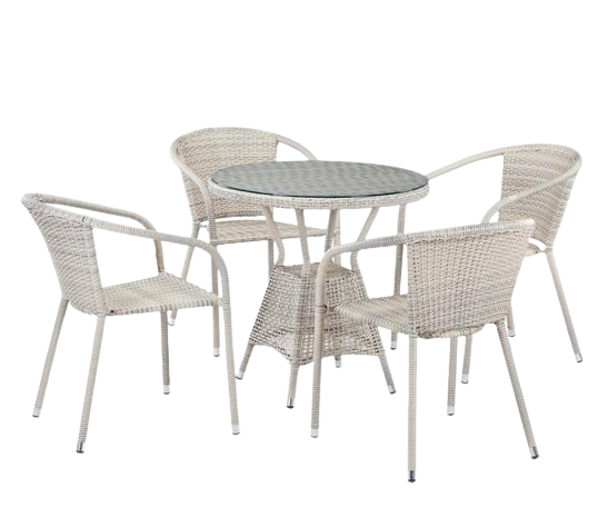 - Описание: стостоит из 4-х стульев и стола. Стекло: закаленное- 5мм. Каркас: труба сталь. Материал: искусственный ротанг. Цвет Латте