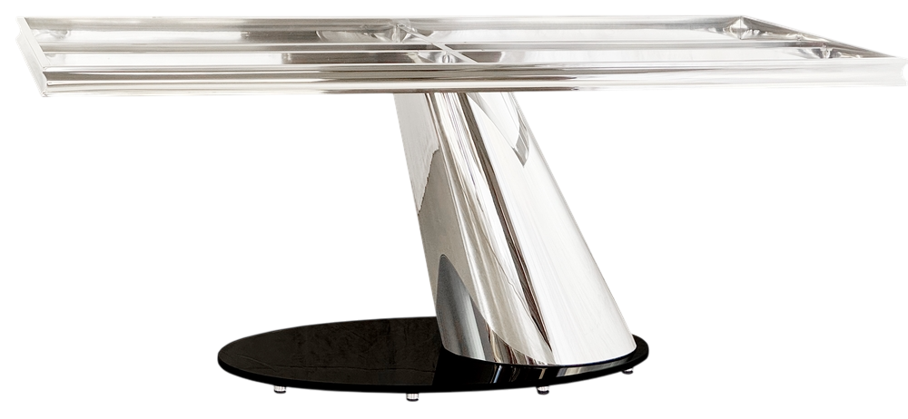 Подстолье из полированной нержавеющей (зеркальное) стали. В основании закаленное стекло толщиной 15 мм. Рама под столешницу размером 176х86.
