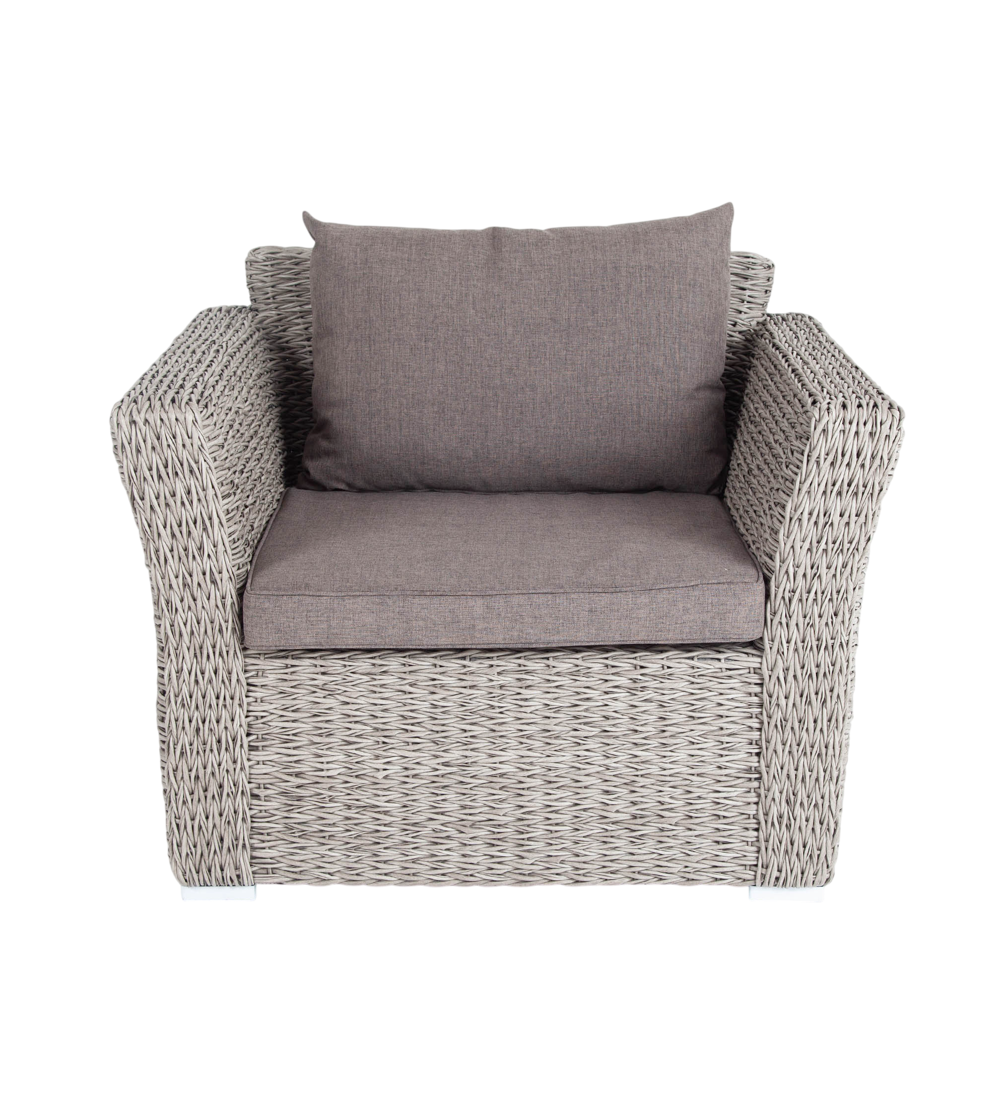 Ее отличает алюминиевый каркас высокой прочности. В качестве декоративной составляющей выступает ручное плетение на основе круглого искусственного ротанга. - Параметры кресла без подушек: Глубина сидения – 630 мм; Высота сидения – 370 мм; Высота спинки – 470 мм.