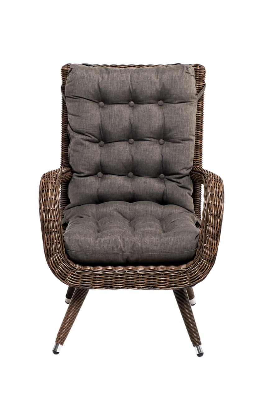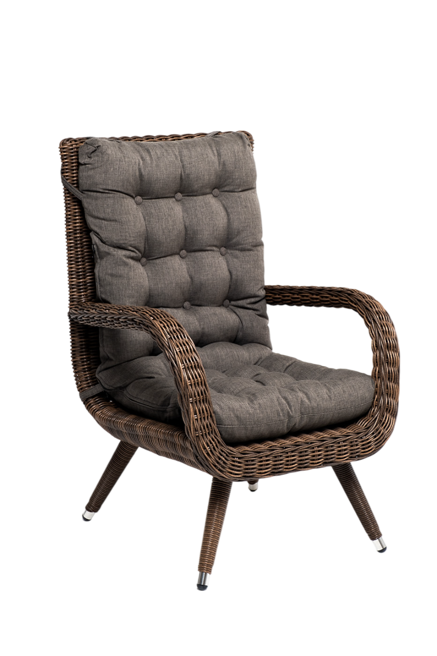 - Преимущество: Садовое кресло дополнено мягкими подушками для комфортного размещения. При их пошиве используется полиэстер с плотностью 300гр/м2. Влагоотталкивающая пропитка усиливает защитные свойства материала.