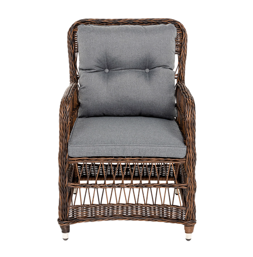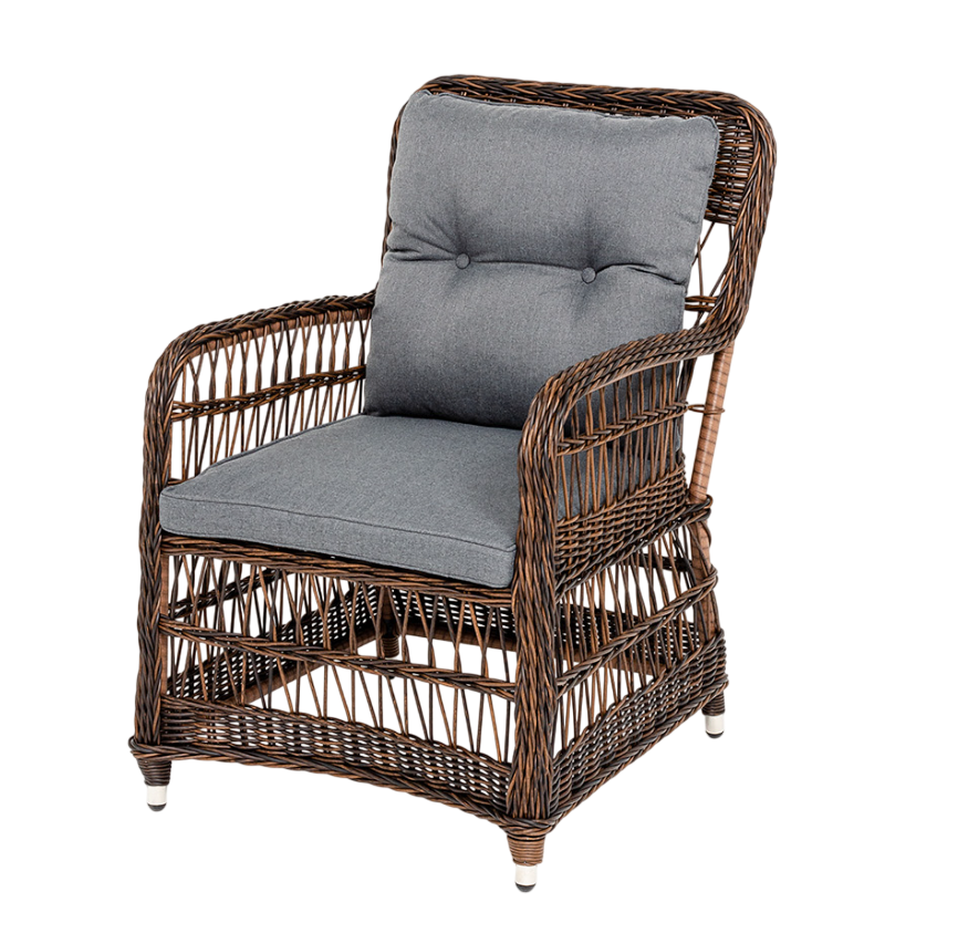 - Преимущество: Садовое кресло располагает двумя мягкими подушками, которые идут в комплекте. Они выполнены в сером цвете. Полиэстер высокого качества используется при пошиве тканевых изделий. Его плотность 300гр/м2. Ткань обрабатывается влагоотталкивающей пропиткой.