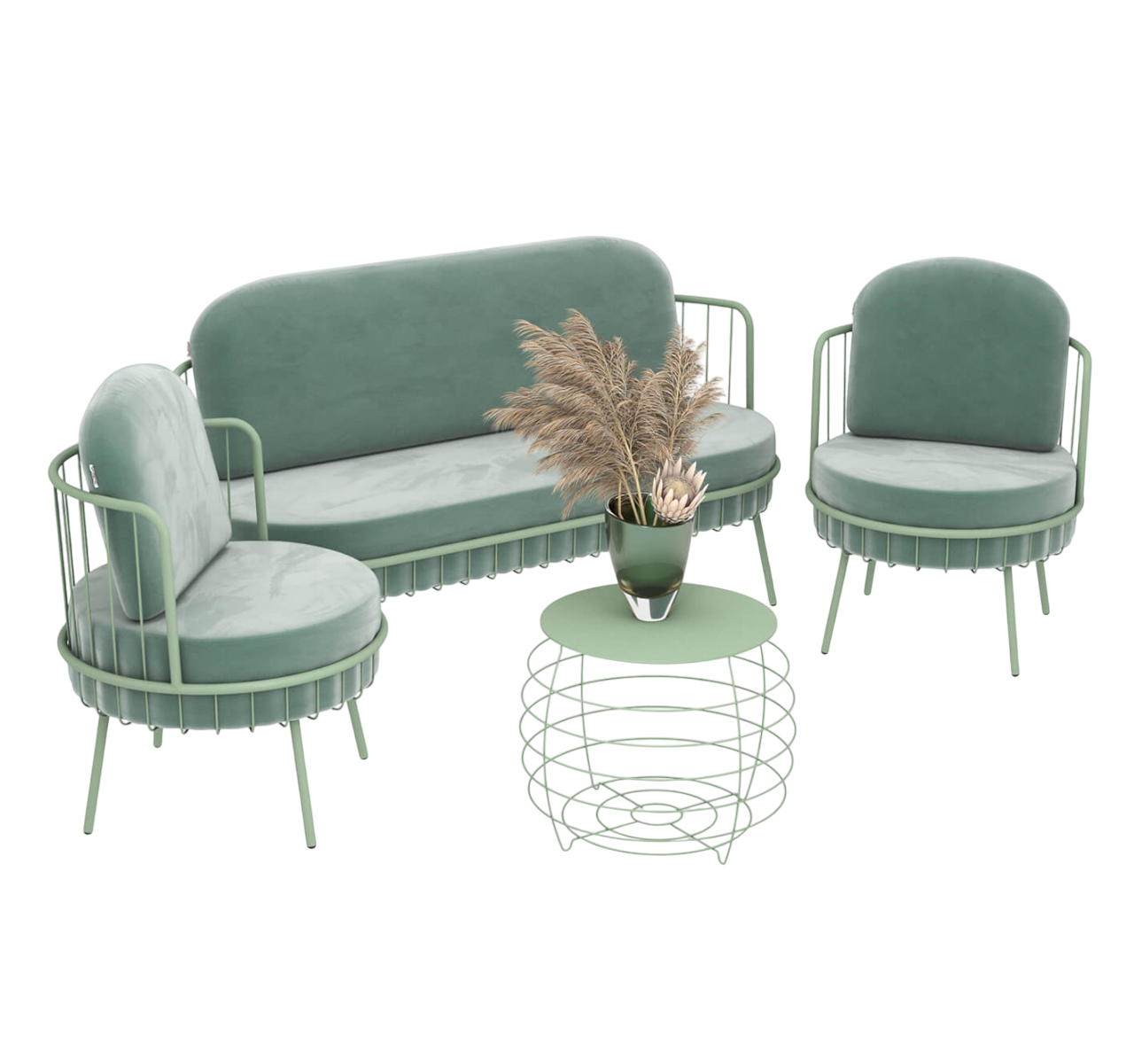 Каркас кресла и дивана выполнены из металла и окрашены порошковой краской, устойчивой к механическому воздействию.