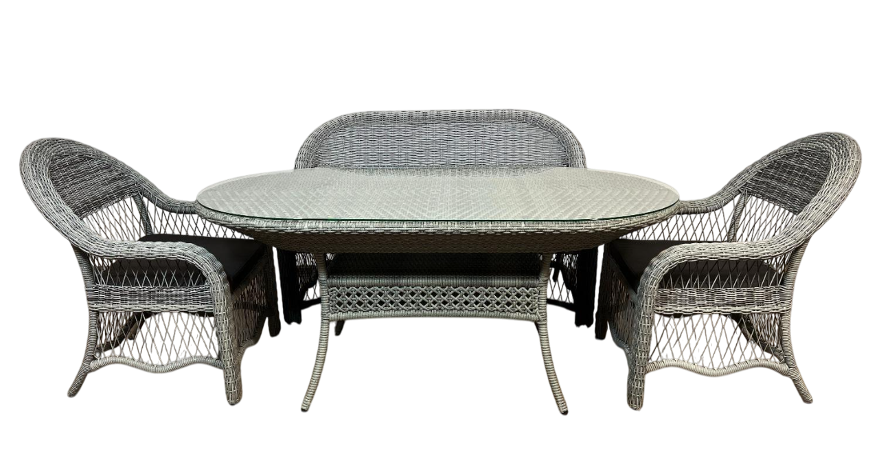 Описание: материал изготовления - искусственный ротанг, обивка - нет, ножки - нержавеющая сталь, столешница - стекло Стол 1670х880х740 мм/кресло 650х680х900 мм/софа 2х-местная 1400х680х900 мм. Цвет серый