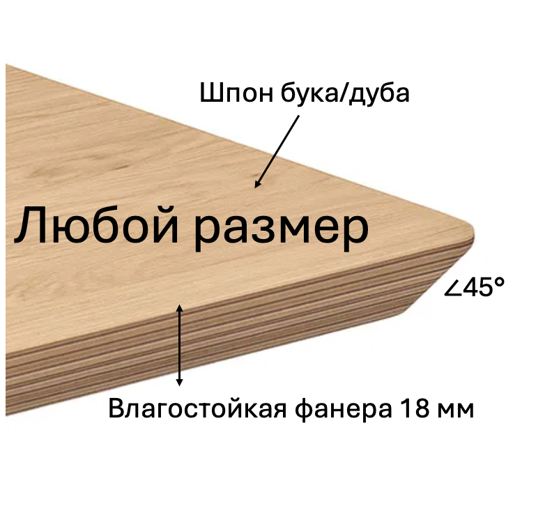 Столешница изготовлена из влагостойкой фанеры толщиной 18 мм. Поверхность столешницы покрыта шпоном натурального дуба толщиной 0,6 мм, что придает ей натуральный и привлекательный вид. Так как фанера является прочным достаточно твердым материалом, это обеспечивает прочное крепление к подстольяю. Кромка столешницы обработана под углом 45 градусов, что делает ее визуально более тонкой и стильной.