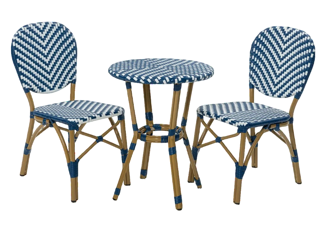 Преимущества: Набор для бистро из 3 предмета / полиротанг бело-синего цвета / алюминиевая труба диам. 25 мм с порошковым покрытием с имитацией бамбукового дерева ,