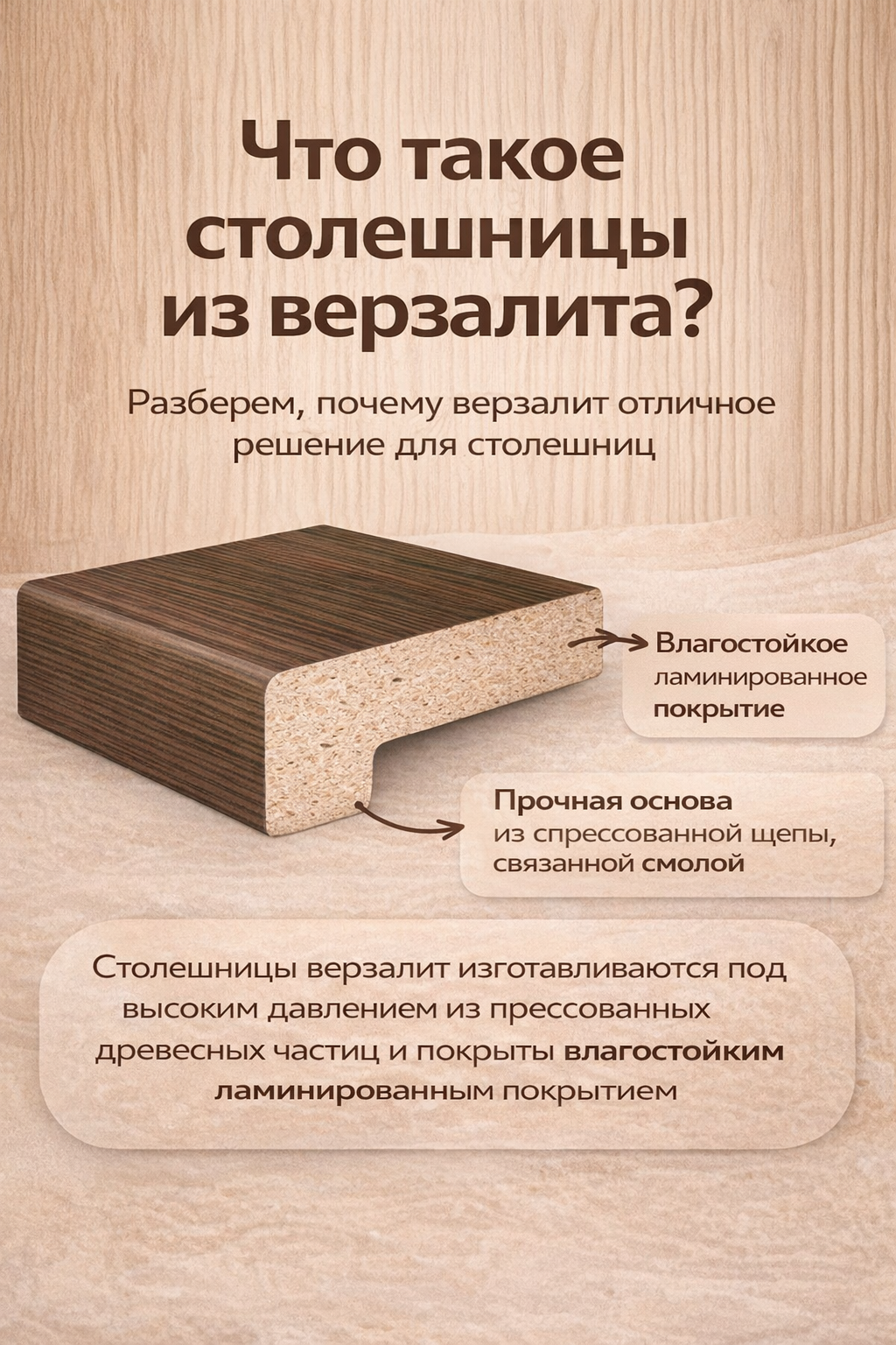 • Описание: монолитная столешница, полученная путем пресования под большой температурой отборной древесной стружки с полимерами. Цвет на выбор.