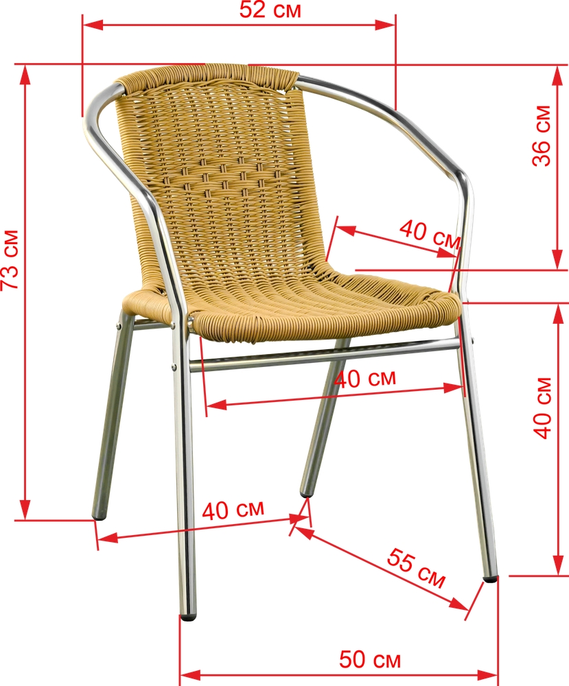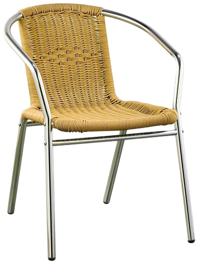 Стул алюминиевый. Каркас: алюминиевая труба, стянутая болтами, полированная до зеркального вида. Параметры трубы: D25мм, толщина стенки 1.2мм. Сиденье и спинка: капроновый прут (D2.8мм, угловое плетение) - имитация ротанга. Стулья стопируемые. В стопке 21 шт.
