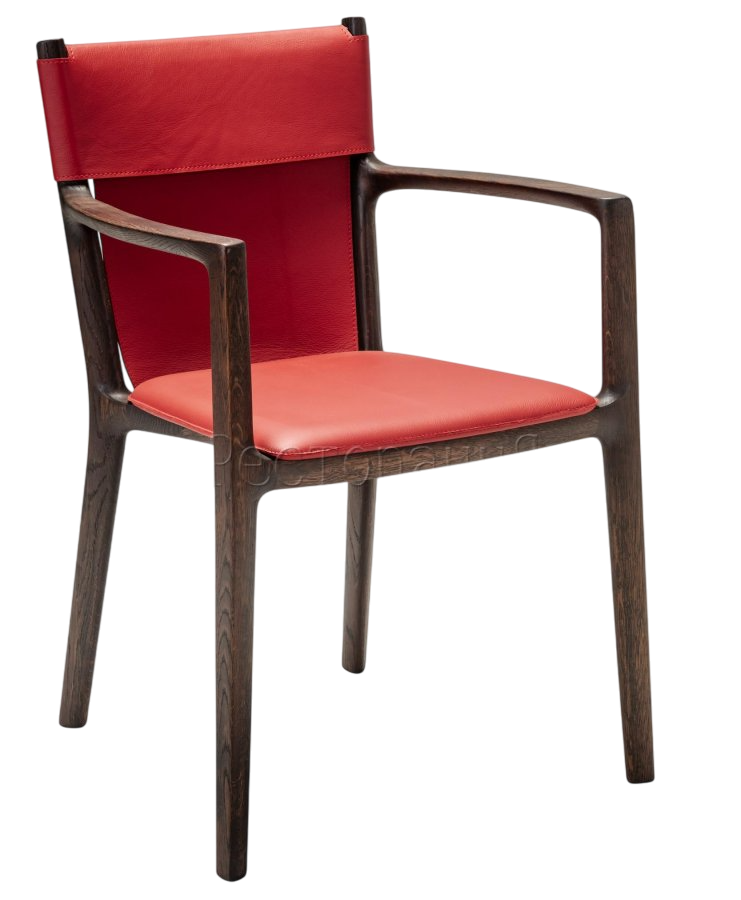 Тонкие подлокотники и ножки кресла в сочетании с обтекаемым силуэтом придают ему изысканный вид, а тонкий профиль сиденья и спинки декорированный натуральной кожей ,с эргономичным наклоном обеспечивает комфорт во время долгих часов обеда и беседы.